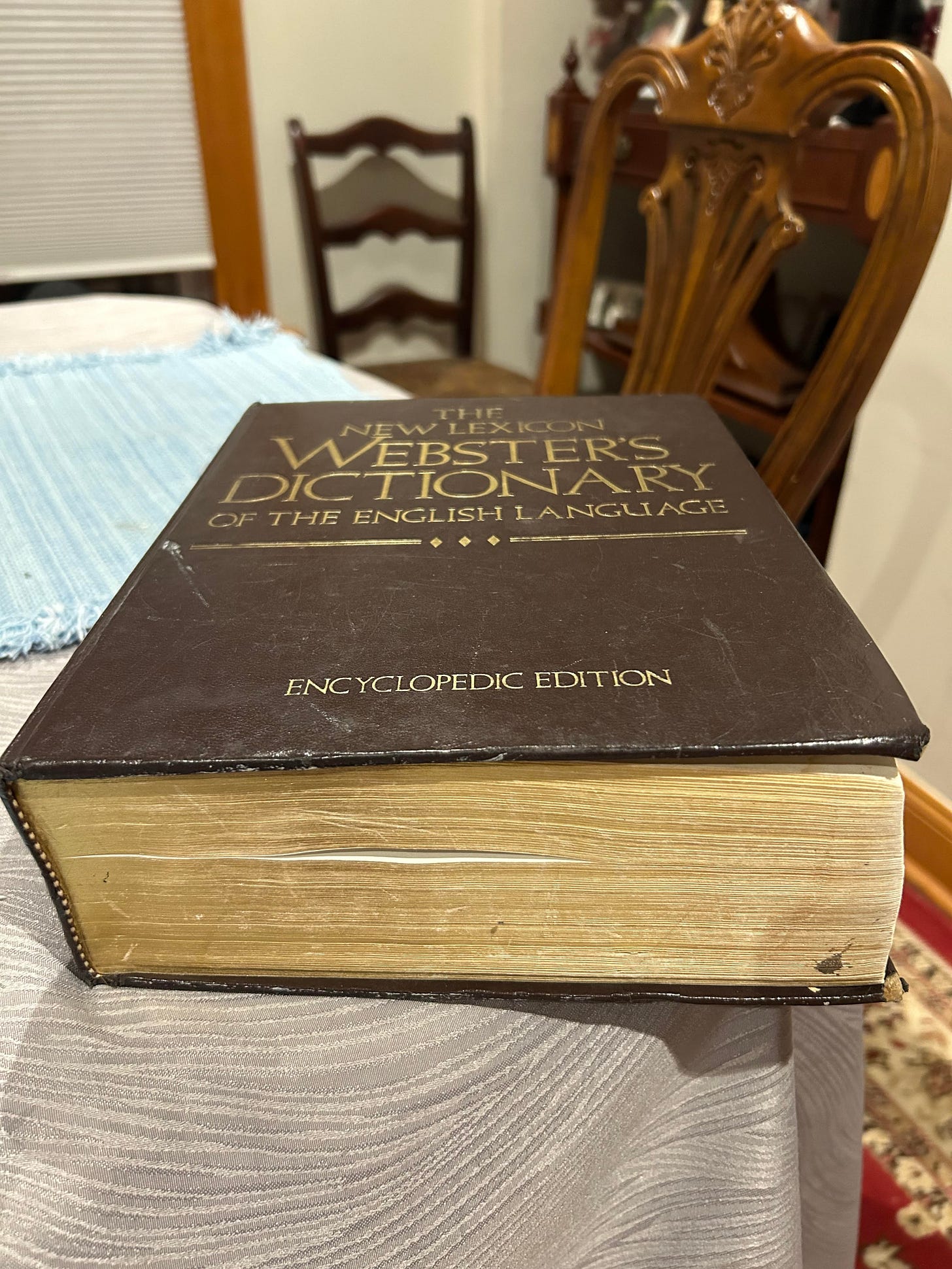 I had trouble finding the right book this morning. After walking around my bookshelves, tracing my finger along spines of potentials, it finally stood out to me: my 1987 copy of the New Lexicon dictionary. It is so large (over 1,149 pages) that I have to place it on its side, because the shelf isn’t tall enough. Here is an image of the book, because you need to see it to believe it.